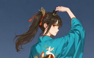 兎と鯉が描かれた青い着物を纏う女剣士。静けさと強さが共存する和風ファンタジーイラストを、世界観・配色・物語性の視点から紹介します。