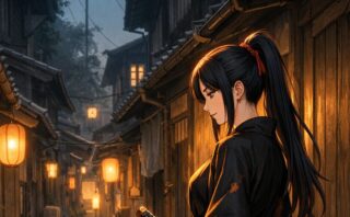 夕焼けに染まる港町を背景に、赤と金の着物を纏った美しい女性を描いた和風イラストを紹介。繊細な表情や髪飾り、花々が織りなす幻想的な世界観を丁寧に解説します。