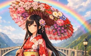 赤い花柄の着物を纏った美しい女性が、虹のかかる橋の上に佇む幻想的な一枚。和傘や自然光、花々が織りなす優雅で温かな世界観を丁寧に紹介します。