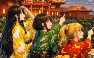 オーロラが揺れる夜の路地に、着物姿の女性と光る花々が広がる幻想的なイラストを物語風に紹介。和と現代、静けさとネオンが交差する美しい一枚の魅力を綴ります。