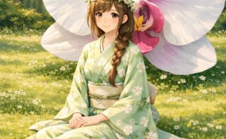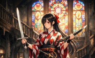 ステンドグラスの光が差し込む廃館に立つ、和装の美しい剣士。静けさと緊張感が交差する幻想的な一枚を、物語風に紹介します。