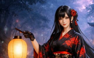 黒地に赤い彼岸花をまとった侍女子が、灯籠を手に神秘の参道を歩む幻想的な一枚。和風美人の艶やかさと凛々しさが共存するイラストの魅力を、短い物語風に紹介します。