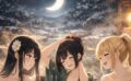 主役は黒地に金の意匠が映える着物姿の侍女子。風に揺れる髪はポニーテールにまとめられ、凛とした横顔が印象的です。波しぶきと夕陽のコントラストが、静かな決意と物語性を引き立てます。