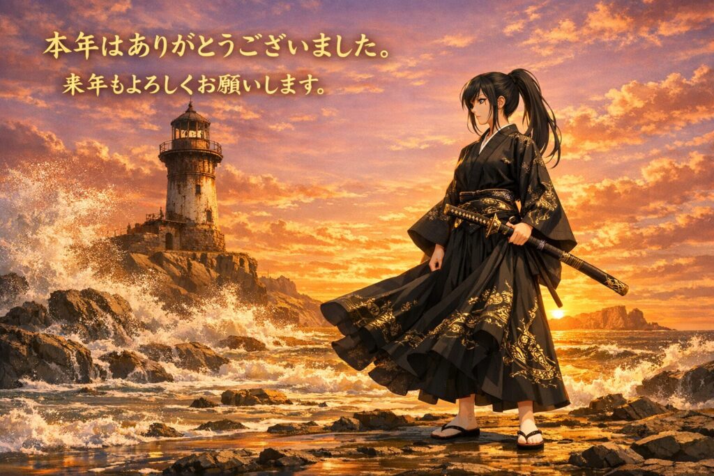 年末のご挨拶に使える、和風ファンタジー調のイラストです。舞台は荒波が打ち寄せる岩礁の海辺。遠景には古びた灯台が立ち、空は晴天の夕焼けに染まっています。