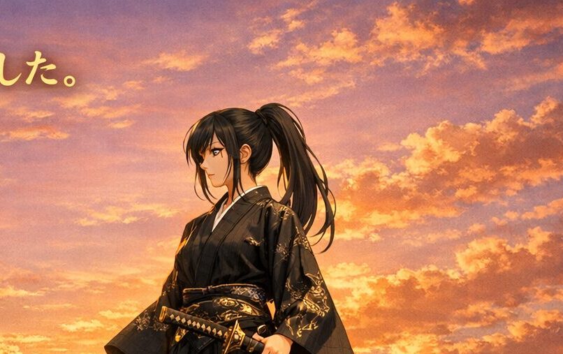 主役は黒地に金の意匠が映える着物姿の侍女子。風に揺れる髪はポニーテールにまとめられ、凛とした横顔が印象的です。波しぶきと夕陽のコントラストが、静かな決意と物語性を引き立てます。