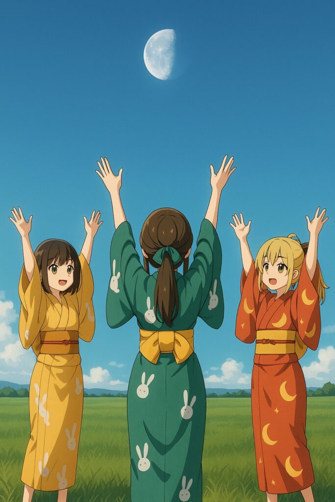 それぞれが満月・半月・三日月をモチーフにした着物を纏い、両手を掲げて空を仰ぎ見ています。