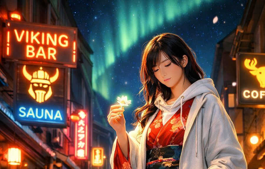 夜の路地に足を踏み入れた瞬間、そこはもう現実と夢の境目でした。頭上には静かに揺れるオーロラ。両脇にはネオンの看板があたたかな光を落とし、石畳には星のかけらのように輝く花々が咲いています。その中心に立つのは、赤い花柄の着物をまといながら、ゆったりとしたパーカーを羽織ったひとりの女性。足元はスニーカーという気負わない装いなのに、不思議なほどこの景色に溶け込み、まるでこの世界の案内人のように見えます。