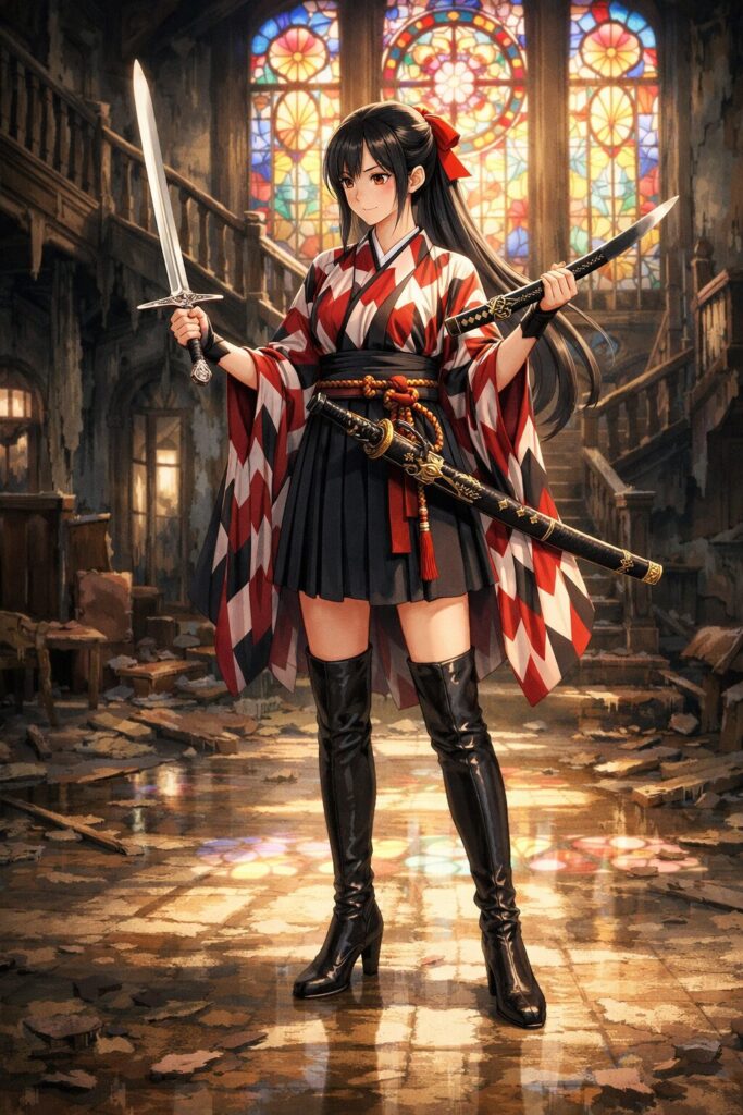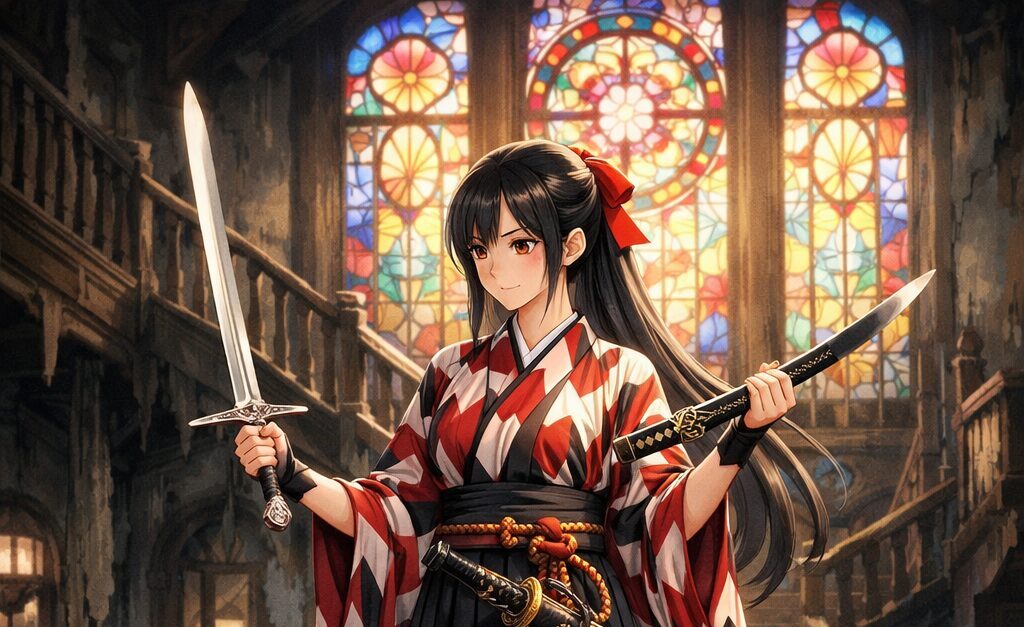 その光の中に立つのは、二つの刃を携えたひとりの剣士。赤と白、そして黒が織りなす和装は華やかでありながら、どこか戦いの気配を帯びています。