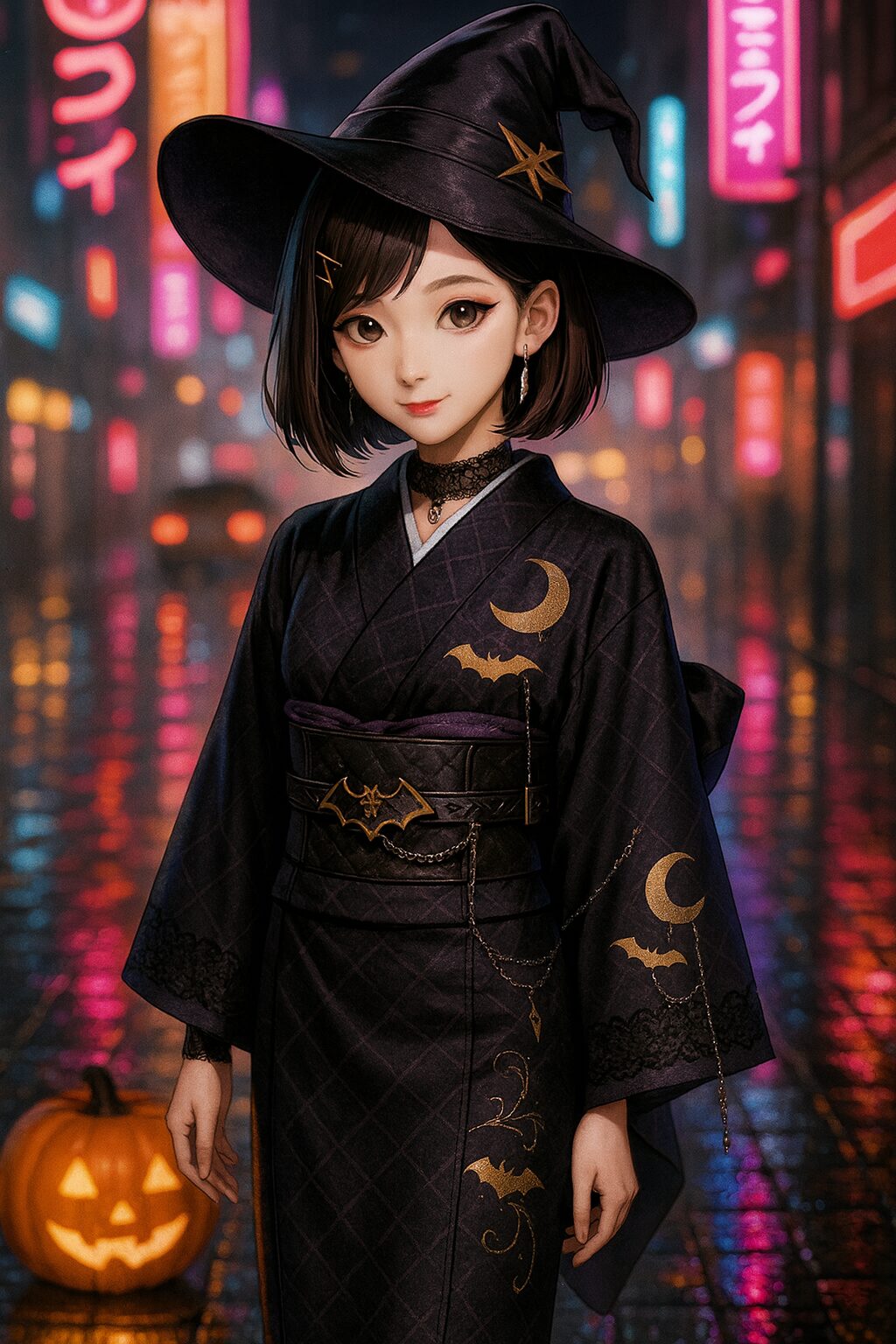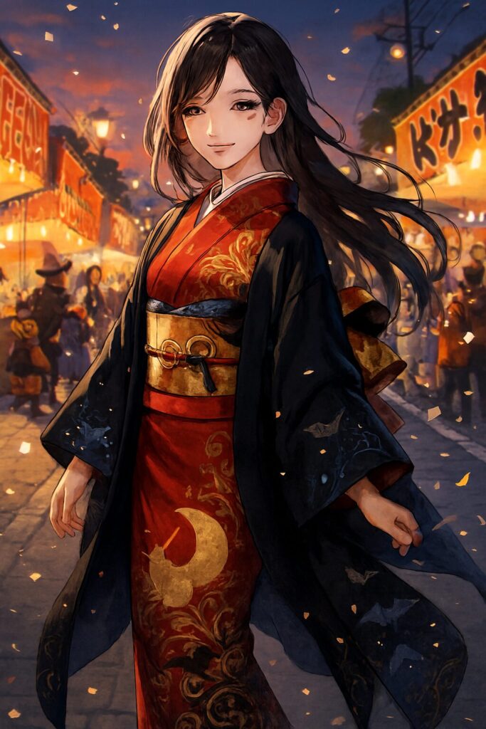 AIイラスト職人 AIAIイラストハロウィン月人着物美人 月人 ハロウィン×秋祭り|薄灯りに微笑むモダン和装の彼女 AIイラスト職人 Twitter コピー 2025.10.30 夕暮れの空が藍へと溶けるころ、屋台の明かりが通りを温かく染め上げる。金の帯を締めた赤の着物、その上に羽織る漆黒の羽織。裾と袖には月と蝙蝠の意匠がさりげなく散り、ハロウィンの遊び心が秋祭りの空気にやわらかく混ざり合う。ゆるやかな風で揺れる髪、舞い落ちる紙片(紙吹雪)の粒感、遠景の人々の気配まで丁寧に描かれ、ノスタルジック×モダンのバランスが心地よい一枚です。