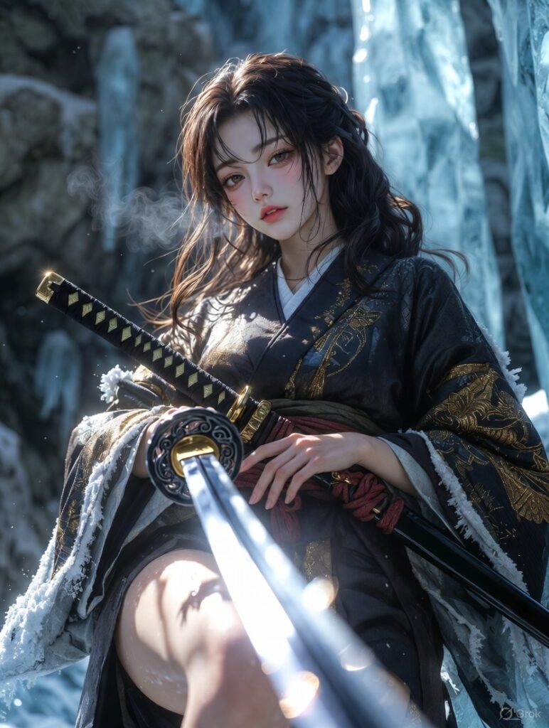 漆黒の着物には金糸の刺繍が細かく走り、龍のような文様が冷たい世界の中で静かに輝きます。袖や裾には凍りついた雪がまとわりつき、長い旅路と過酷な戦いをさりげなく物語っているかのようです。手には抜き放たれた刀。画面手前へまっすぐ伸びる刀身には光が反射し、見る者の視線を一気に引き込みます。