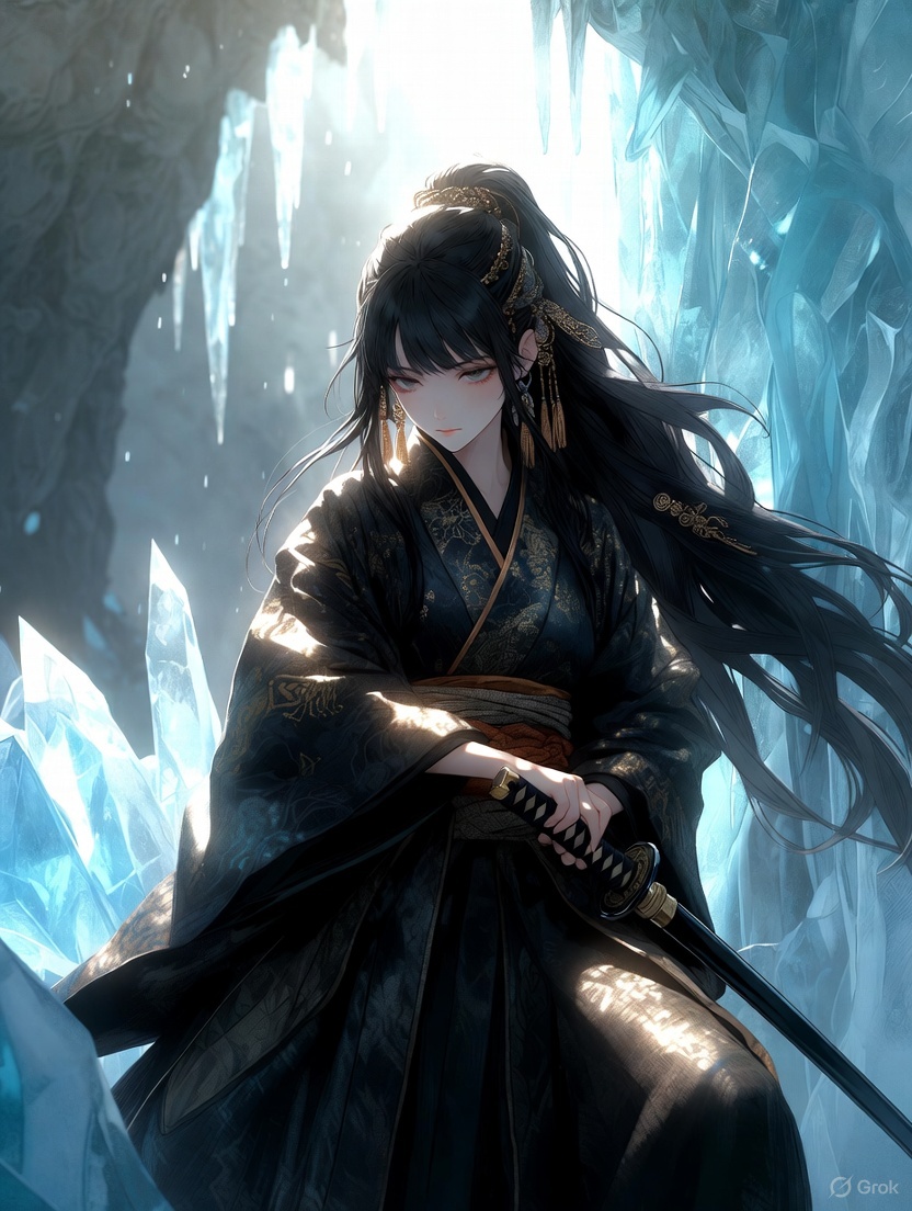 漆黒の着物には金糸の刺繍が細かく走り、龍のような文様が冷たい世界の中で静かに輝きます。袖や裾には凍りついた雪がまとわりつき、長い旅路と過酷な戦いをさりげなく物語っているかのようです。手には抜き放たれた刀。画面手前へまっすぐ伸びる刀身には光が反射し、見る者の視線を一気に引き込みます。