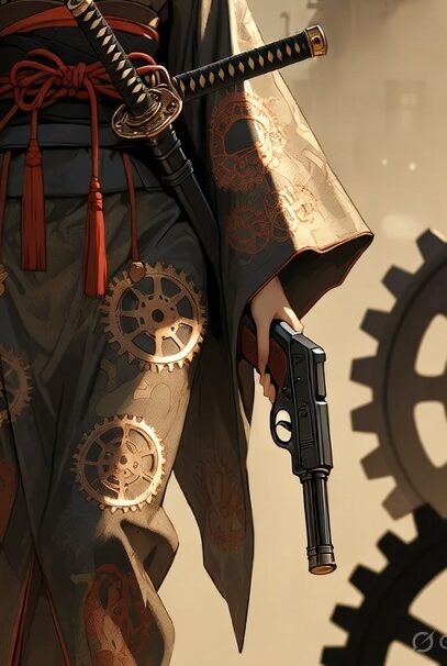 腰の刀に加え、手にした銃器がこの世界の技術水準を語ります。**「武士の美学」×「近代兵器」**という組み合わせが、単なる和装キャラではなく、スチームパンク世界で生きる戦闘者としての説得力を生んでいます。