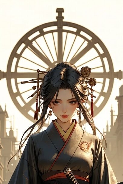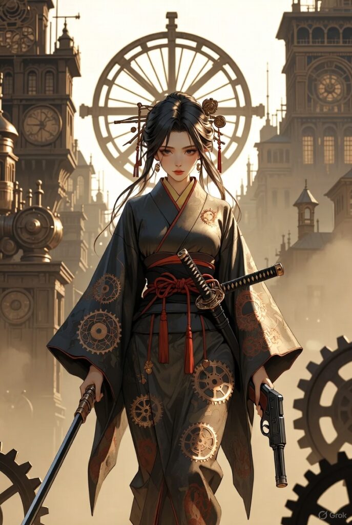 歯車が鳴るような静けさの中、時計塔がそびえる都市をまっすぐ歩いてくる“侍女子”。今回ご紹介するイラストは、スチームパンクの機械美と和装の艶やかさが高密度に融合した一枚です。
