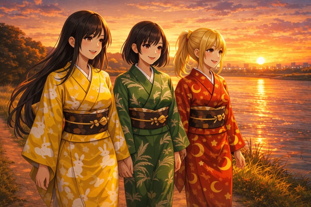月人 夕日の河原を歩く月の三姉妹――光に包まれた着物姿の物語
