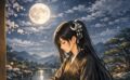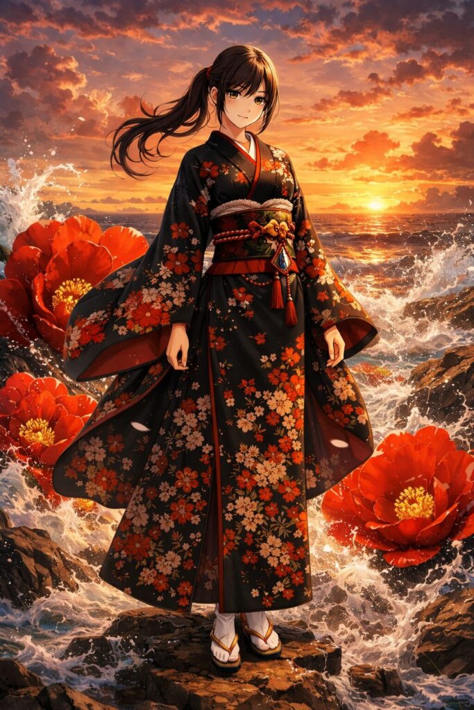 今回ご紹介するのは、夕焼けに染まる海辺を背景に、黒地の花柄着物を纏った美しい女性を描いた一枚です。