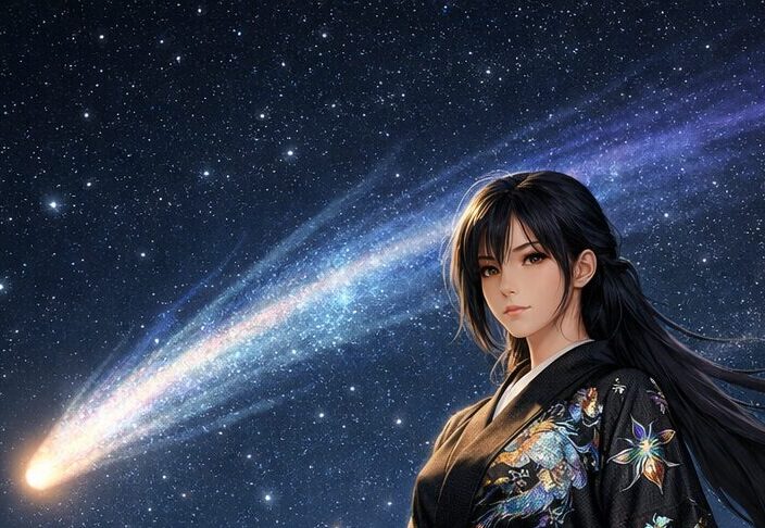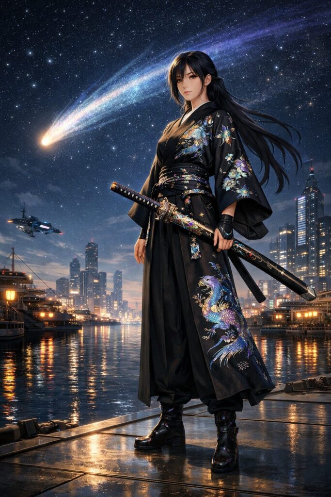 星降る夜の未来港に立つ侍女子は、時代を超えた美と強さを象徴する存在です。