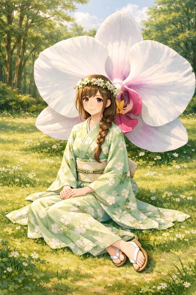 小さな花が咲く草の上に、淡い緑の着物をまとった少女が静かに座っています。