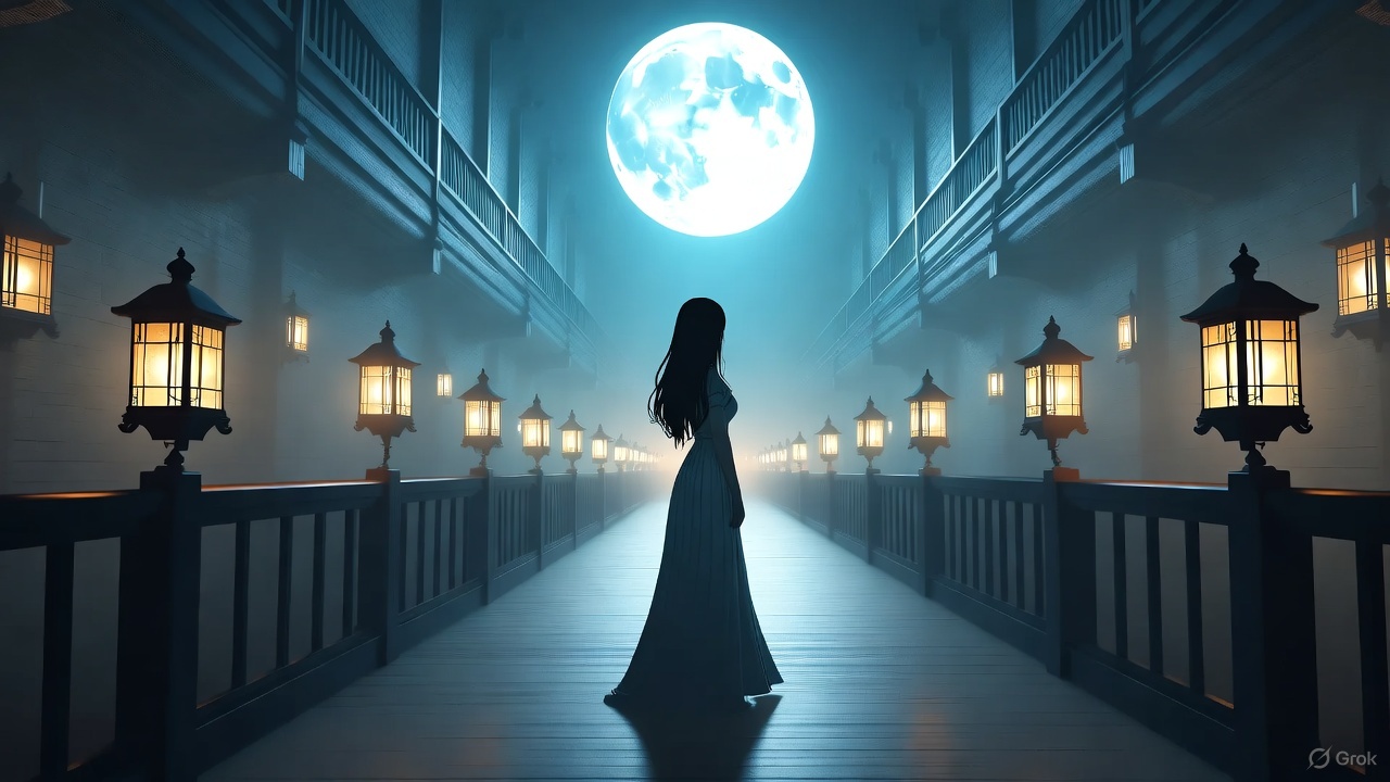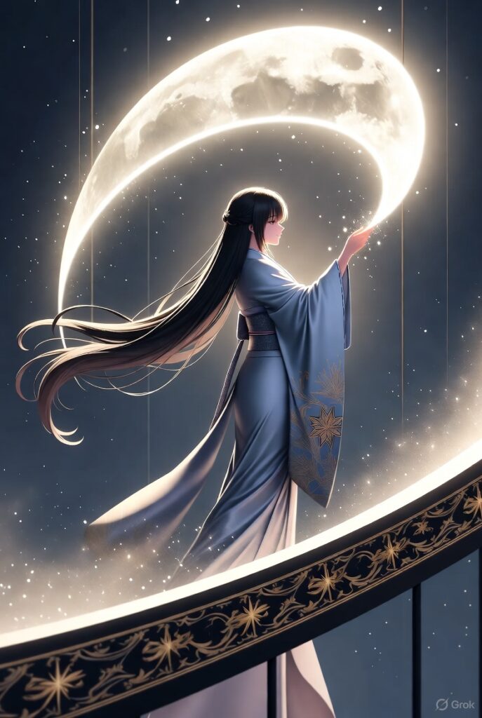 半月が舞台照明のように弧を描き、宙に漂う光の粒子が「時間の砂」のように零れ落ちる。女性は藍の気配を帯びた淡青の着物に金糸の花文。長い黒髪が微風にほどけ、指先は月の縁をそっと撫でる。