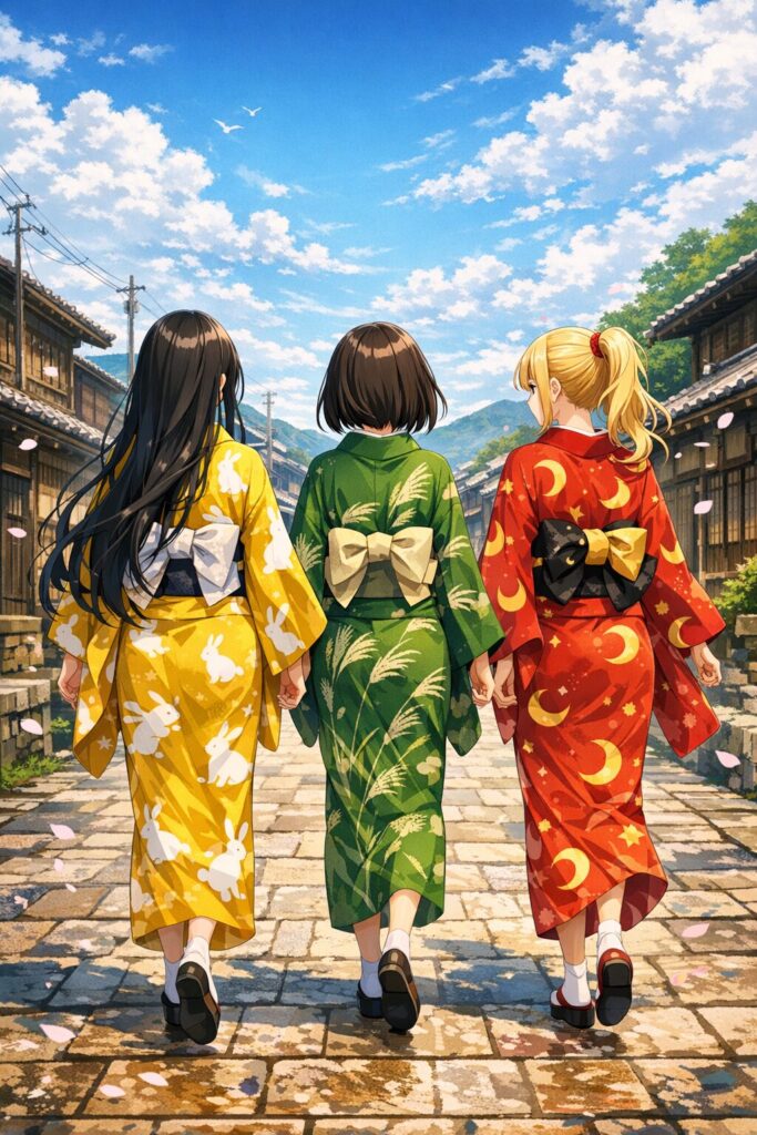 左の黄色い着物は、白いうさぎ模様。やわらかく明るい印象を持ち、無邪気さや純粋な希望を感じさせます。新しい世界へ飛び込む軽やかさを象徴する存在です。