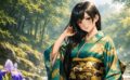 黄色の着物をまとった姉は、湯気の立つお茶を両手で包み込みながら、ほっとしたように目を細めます。緑の着物の妹は、つややかな団子を手に取り、まるで旅の景色まで味わうように楽しそうに微笑みました。赤い着物の末の妹は、明るい声で何かを話し、二人を笑わせています。