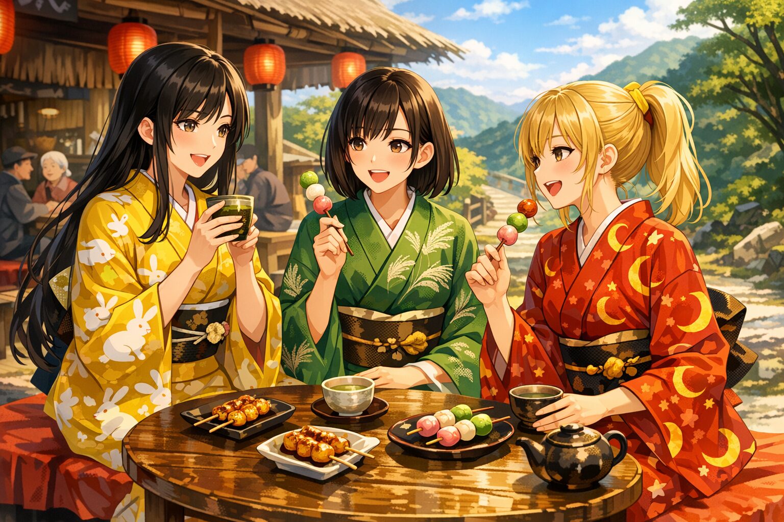 黄色の着物をまとった姉は、湯気の立つお茶を両手で包み込みながら、ほっとしたように目を細めます。緑の着物の妹は、つややかな団子を手に取り、まるで旅の景色まで味わうように楽しそうに微笑みました。赤い着物の末の妹は、明るい声で何かを話し、二人を笑わせています。