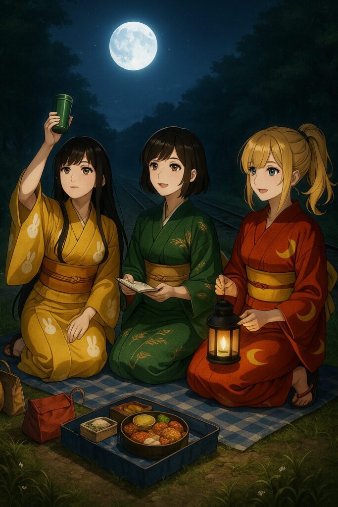 黄色い着物にうさぎ柄の満月の姉は、湯気の立つボトルを高く掲げて月に乾杯。穏やかな表情からは、これから始まる長い旅への決意と高揚感が伝わってきます。緑の着物にススキ柄の半月の姉は、膝の上で静かに地図か切符を確認中。慎重で面倒見のよい“旅のナビゲーター”といった雰囲気です。赤い着物に三日月柄の妹は、手元のランタンに火を灯しながら、どこか好奇心に満ちた横顔を見せています。