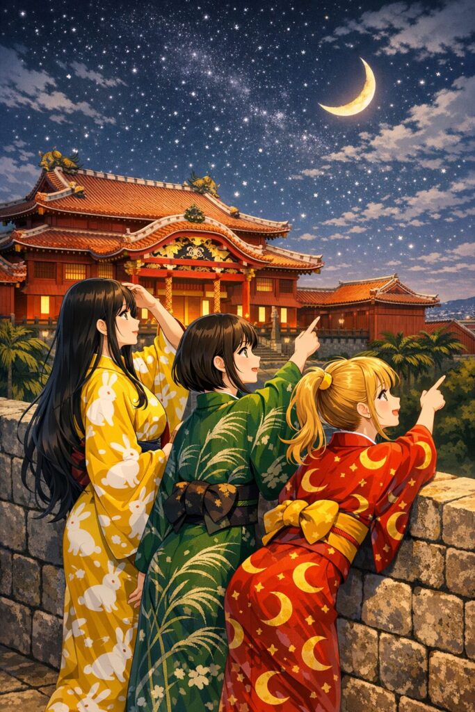 朱色に輝く城、石垣のぬくもり、南国を思わせる植物、そして夜空に手を伸ばす三人の姿。
