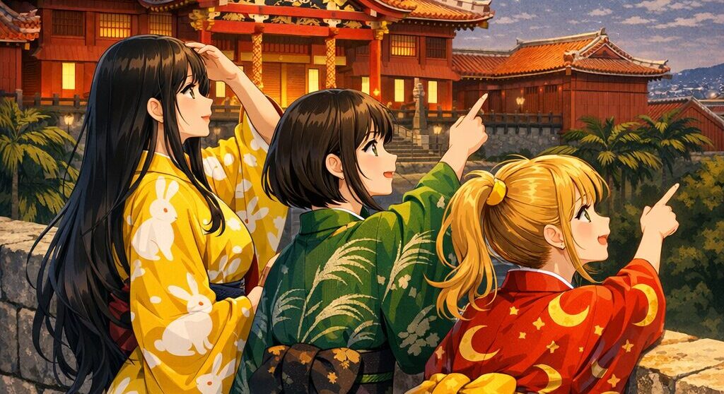 朱色に輝く城、石垣のぬくもり、南国を思わせる植物、そして夜空に手を伸ばす三人の姿。