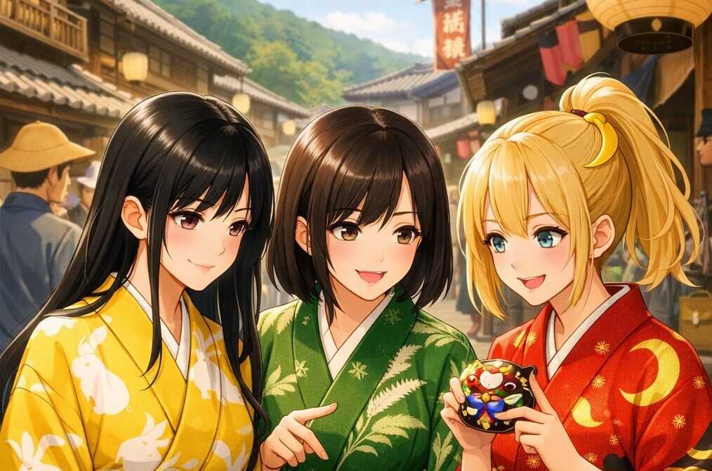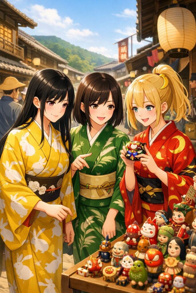 朝の光がやわらかく町を包み込むころ、月の三姉妹はそろって縁日の通りを歩いていました。