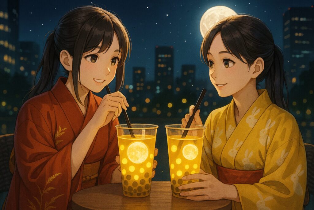 柔らかな光を放つ満月をそのままカップに閉じ込めたような、特別なドリンクを楽しむ着物姿の女性たち。テーブルを挟んで微笑み合う姿からは、友人同士の親しさと、月を愛でる和の心が感じられます。