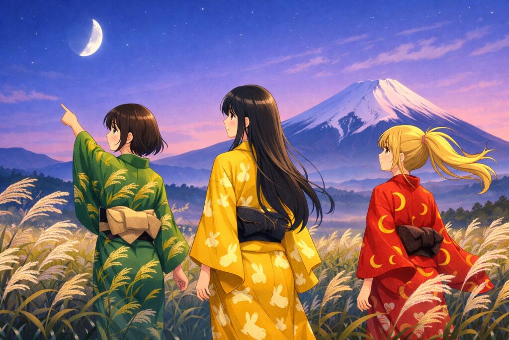 秋の大地とつながる存在。月を最初に見つけ、指を差す仕草が印象的です。 - 黄色の着物 × 兎模様