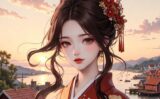 白く透けるような肌に、印象的なのは淡く紅を差したまぶた。伏せがちな視線はどこか遠くを見つめていて、現実より少しだけ深い場所――記憶や夢の底を覗いているかのようです。口元には微かな朱色、言葉にならない感情をぎゅっと結び留めているような表情が印象的です。
