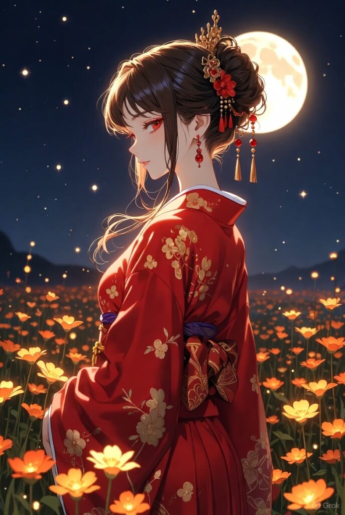 満月の夜、赤い着物に身を包み花畑に佇む女性。