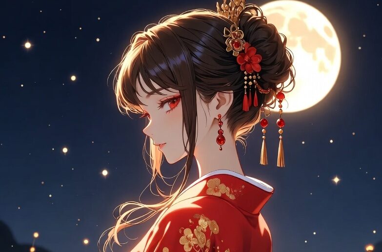 満月の夜、赤い着物に身を包み花畑に佇む女性。