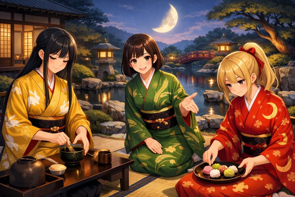 このイラストは、そんな月夜の庭で過ごす三姉妹の穏やかな時間を切り取った一枚です。