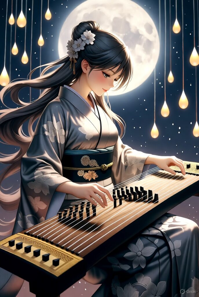 うつむいた横顔は凪いだ湖面のように静かで、まつげの影が頬に落ちる。風が裾を撫で、花柄は月明かりを受けて薄い銀の霜になる。奏でられるのは誰かを想う短い手紙。弾き終えた指先にわずかな震えが残り、夜はそれを包み隠す。