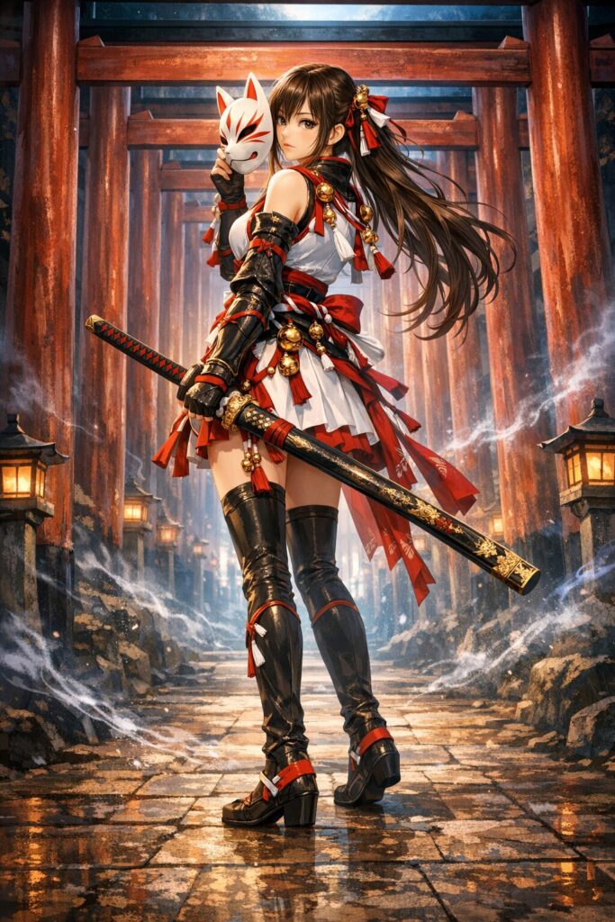 衣装デザインも非常に魅力的です。白を基調とした装いに、赤いリボンや組紐の装飾が鮮やかに映え、神聖さの中に華やかさがしっかりと宿っています。さらに黒のアームカバーやロングブーツが全体を引き締め、可憐さだけでなく戦う者としての芯の強さを感じさせます。和のモチーフを取り入れながらも、どこか現代的でスタイリッシュな印象があり、伝統と創作のバランスがとても美しい一枚です。
