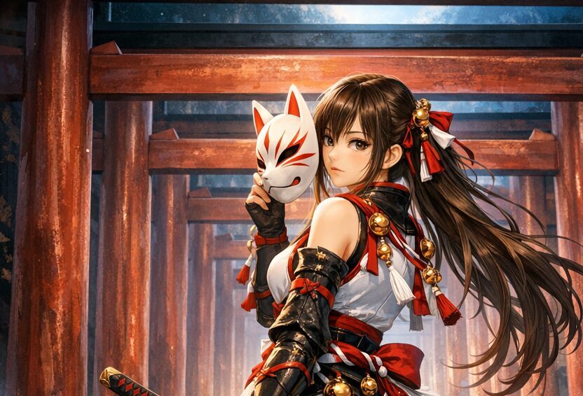 彼女がそっと手に持つ狐面は、単なる小道具ではなく、このイラストの世界観を決定づける重要なモチーフに見えます。顔を隠すための仮面なのか、儀式のためのものなのか、それとも彼女自身のもう一つの側面を示しているのか。明確な答えが描かれていないからこそ、想像が広がります。