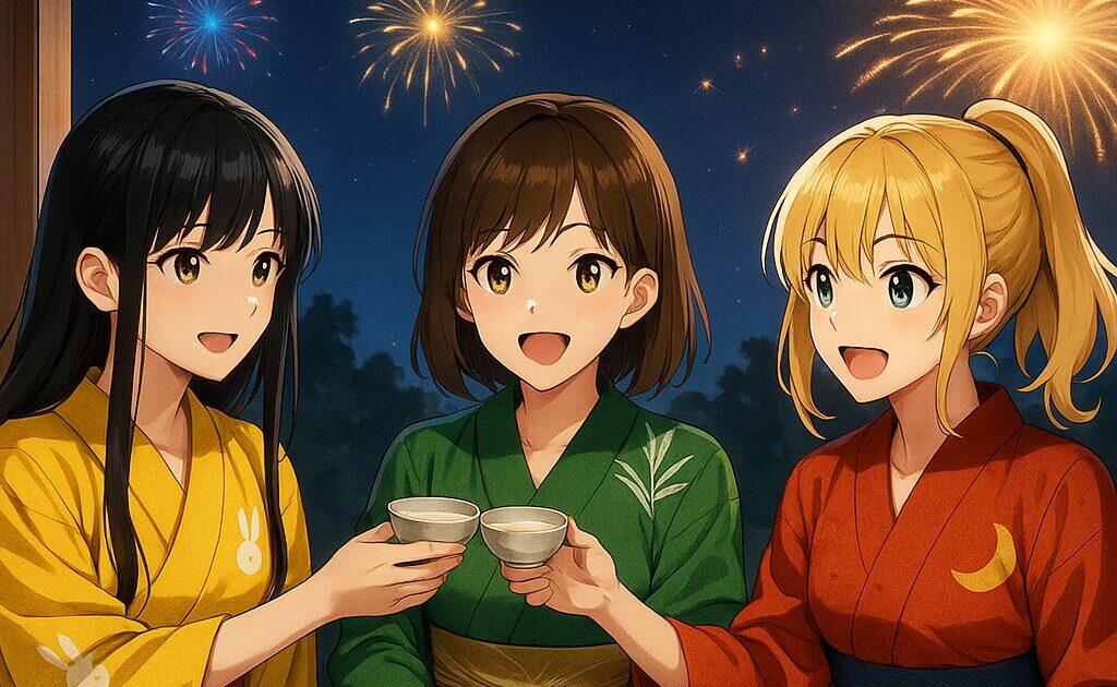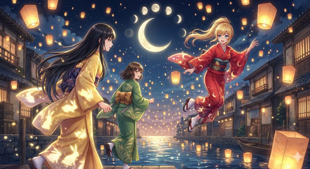 灯籠が舞い、夜空と水面が同じ光で満たされる――そんな“息をのむ一瞬”を切り取った、「月の三姉妹」の幻想和装イラストをご紹介します。