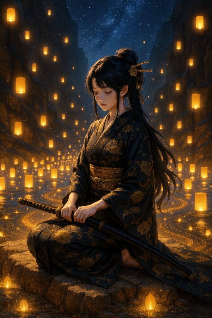 その中心で、黒地に金の花模様をあしらった着物の女性が、膝をついて座しています。手には一振りの刀。鞘を両手で包み込むように握りしめ、目を閉じた横顔には、戦いの前の緊張ではなく、静かな祈りと覚悟が宿っています。髪をまとめる簪にも金色の装飾が施され、灯籠の光を受けてほのかに輝き、画面全体の重厚な世界観を引き締めています。