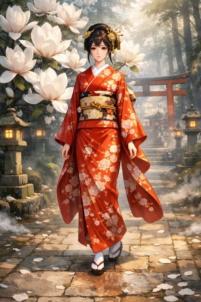 まるで白木蓮のような、やさしく気品のある花びらが画面いっぱいに広がり、赤い着物とのコントラストをより印象的にしています。白と赤、光と霧、静けさと華やかさ。そのバランスがとても美しい一枚です。