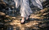 女侍は、重厚な紋様をまとった黒地の着物に身を包み、腰には白い帯。風に揺れる髪と袖が、厳しい環境の中にもどこかしなやかな強さを感じさせます。両手で握る刀は、夜空の星の光を受けて鋭く輝き、その切っ先には一点だけ強い光が宿っています。それは、流れゆく時間に飲み込まれまいとする彼女の意志そのもののようです。