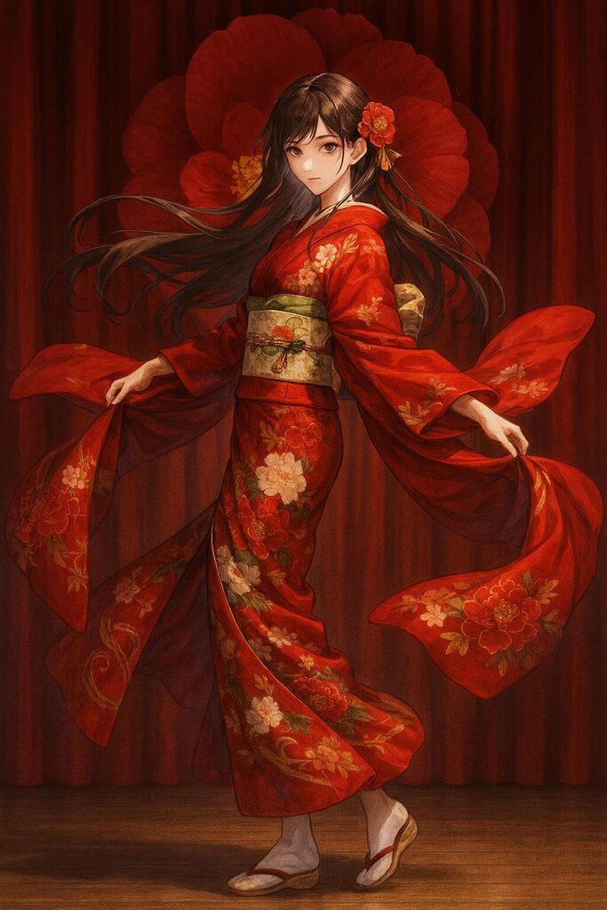 舞台の床、幕、花、着物――すべてが赤のグラデーションで統一されているにもかかわらず、単調さはなく、むしろ色の層の深さを感じる構成です。光と影のコントラストが巧みに描かれているため、画面から彼女がふわりと一歩、こちら側へ降りてきそうな立体感があります。