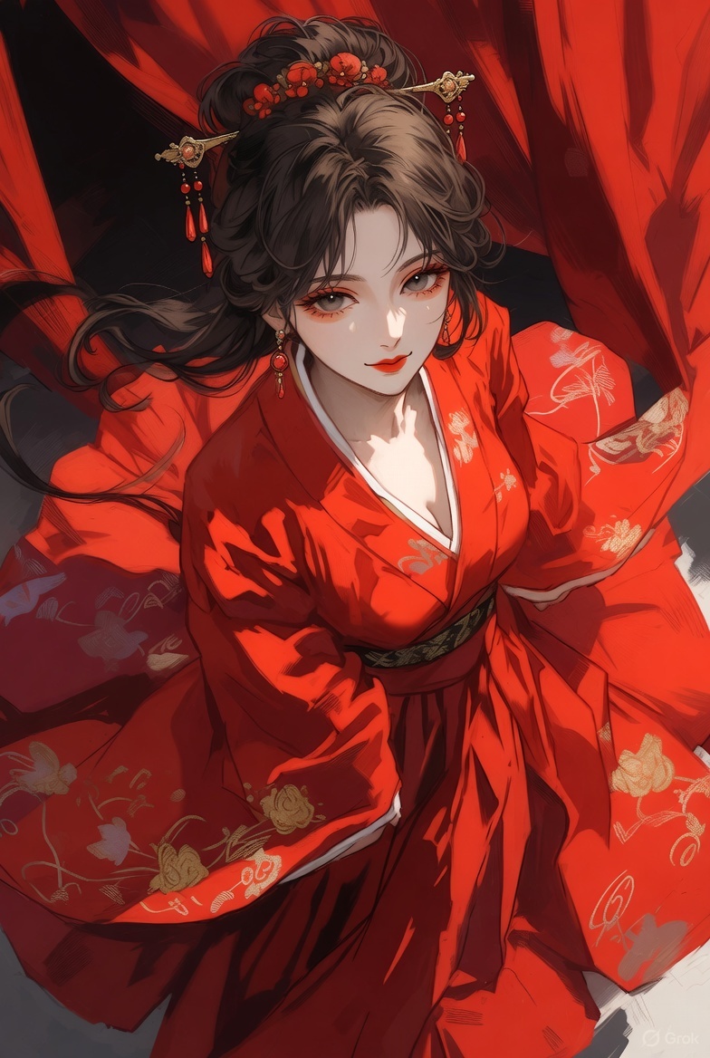 袖を大きく広げたポーズは、今まさに一歩踏み出して舞い始める直前の瞬間。流れるような黒髪は見えない風を受けて揺れ、赤一色の世界にしっとりとした陰影をつくり出しています。視線はまっすぐこちらを見つめながらも、どこか物語を秘めたような静かな強さを感じさせます。