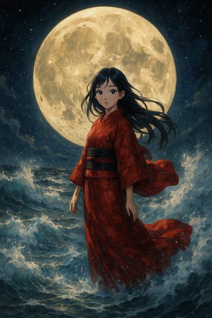 荒波と満月に照らされる赤い振袖の女性 ― 神秘的な一枚