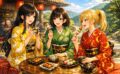 遠くには尖塔のそびえる城、空には悠然と浮かぶ飛行船。蒸気と幻想が入り混じる景色の中で、彼女だけが次に進む道を知っているようだった。にぎやかな市場のざわめきさえ、彼女の周囲だけは不思議と静かに感じられる。この一枚の魅力は、和の艶やかさと冒険の高揚感が同時に息づいていることにある。旅立ちの直前、まだ誰にも語られていない物語の一ページ。そんな想像を自然に広げてくれる、印象深い作品だ。
