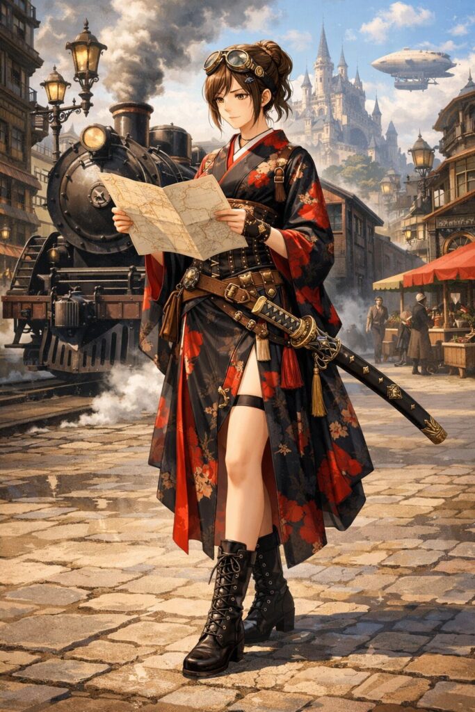 石畳に朝の光が落ちるころ、蒸気の街はゆっくりと目を覚ます。黒煙を吐く機関車の前に立つひとりの旅人は、黒と紅の花模様の着物を揺らしながら、静かに地図を見つめていた。髪に掛けたゴーグル、腰に差した刀、そして迷いのないまなざし。その姿は、この街の日常に溶け込みながらも、どこか別の物語から現れたような気配をまとっている。