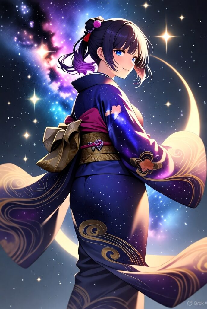 月人 銀河をまとう着物美人 ── 夜空とともに微笑む彼女