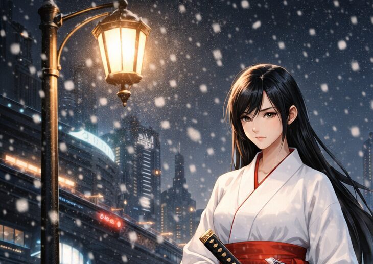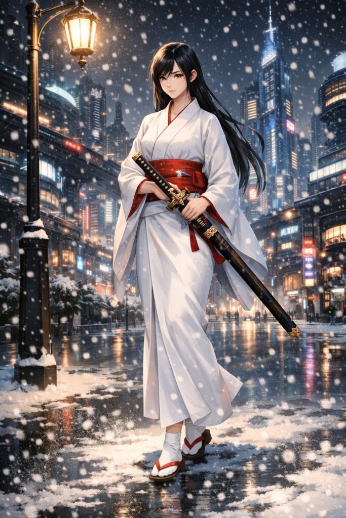 無機質な都市と、伝統を感じさせる装い。冷たい雪景色と、人物の持つ静かな熱。現代的な高層建築と、刀という象徴的な存在。相反する要素が違和感なく同居しているからこそ、画面全体に独特の緊張感と美しさが生まれています。派手に動いていないのに、視線を離せない。歩いているだけなのに、背景のどんな光よりも強く目に残る。それは、この人物が“絵の主役”である以上に、“世界観そのものの核”になっているからかもしれません。