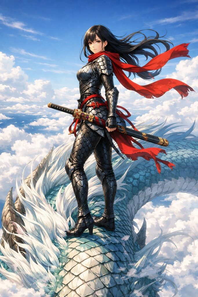 このイラストは、勇ましさ、美しさ、そして冒険の始まりを感じさせる、迫力ある和風ファンタジーアートです。